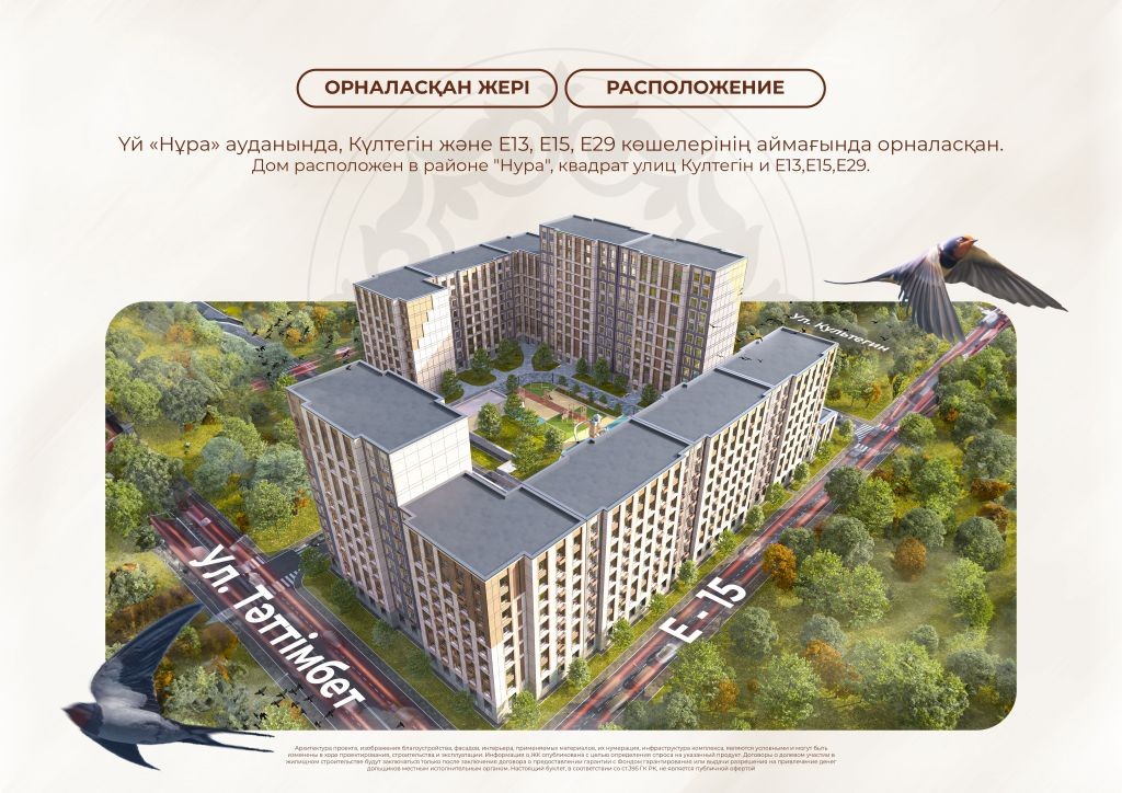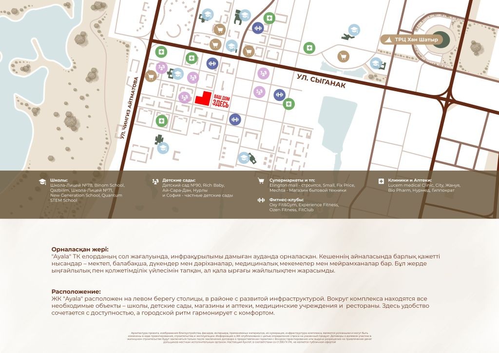 ЖК "Ayala" расположен на левом берегу столицы, в районе с развитой инфраструктурой. Вокруг комплекса находятся все необходимые объекты – школы, детские сады, магазины и аптеки, медицинские учреждения и рестораны.