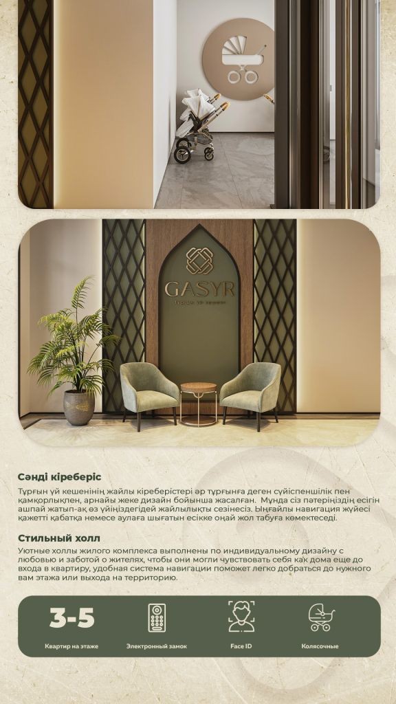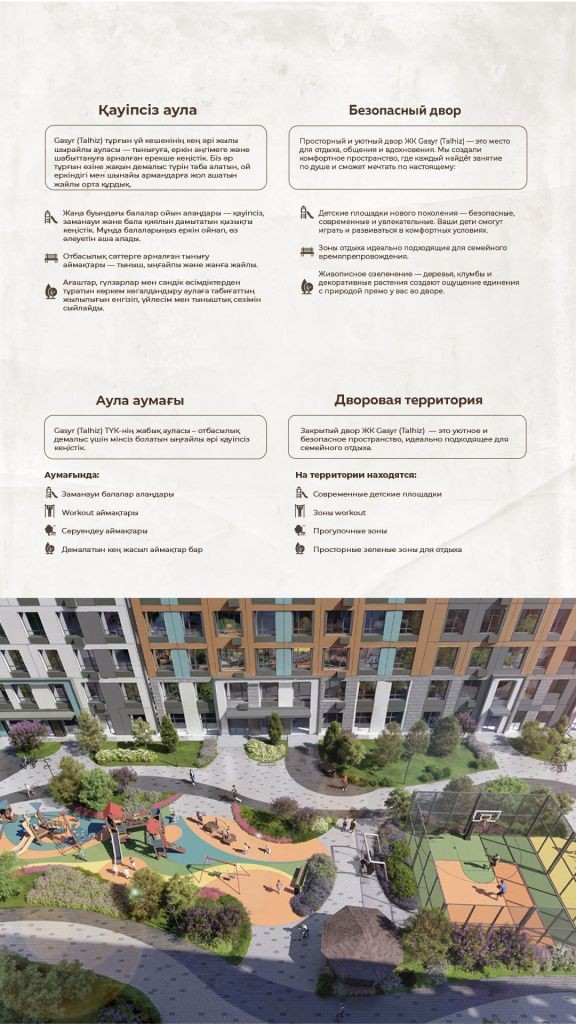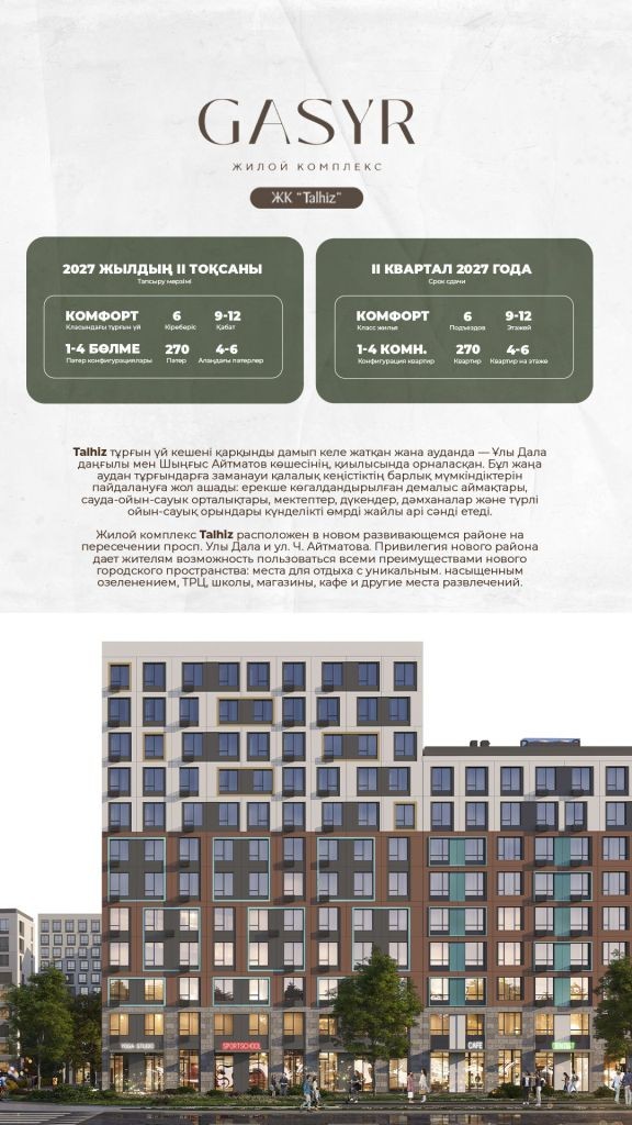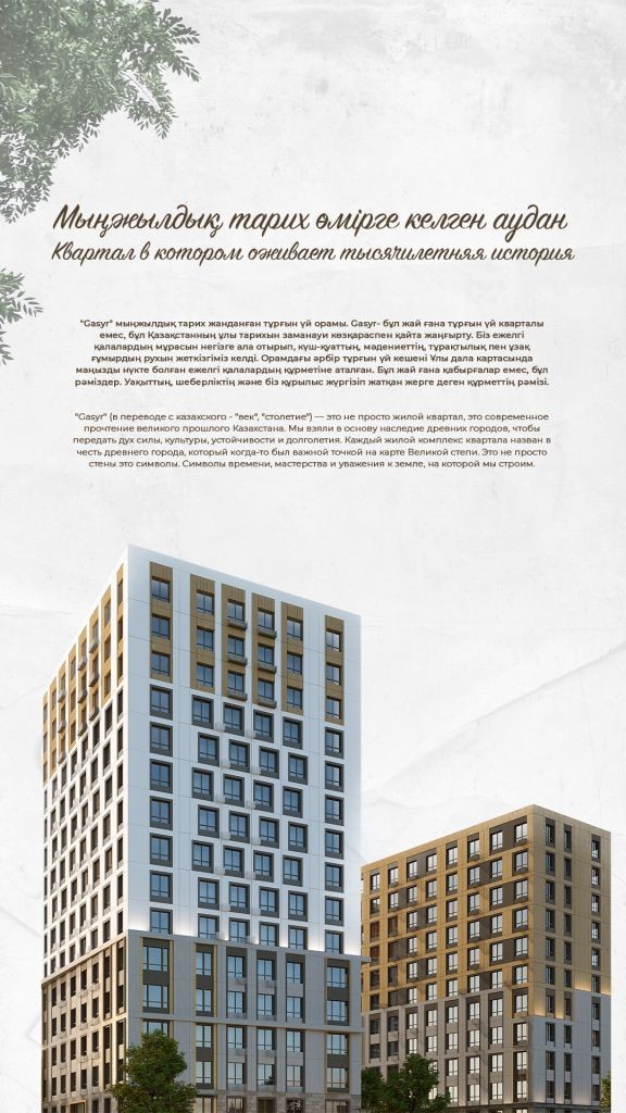 "Gasyr" (в переводе с казахского – "век", "столетие") — это не просто жилой квартал, это современное прочтение великого прошлого Казахстана. Мы взяли в основу наследие древних городов, чтобы передать дух силы, культуры, устойчивости и долголетия.Каждый жилой комплекс квартала назван в честь древнего города, который когда-то был важной точкой на карте Великой степи. Это не просто стены — это символы. Символы времени, мастерства и уважения к земле, на которой мы строим.