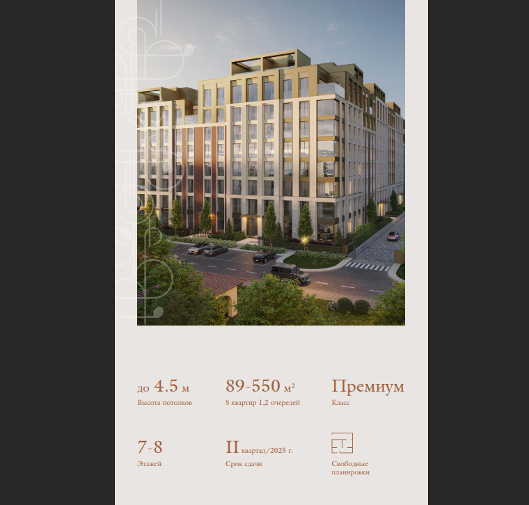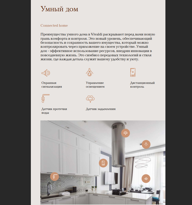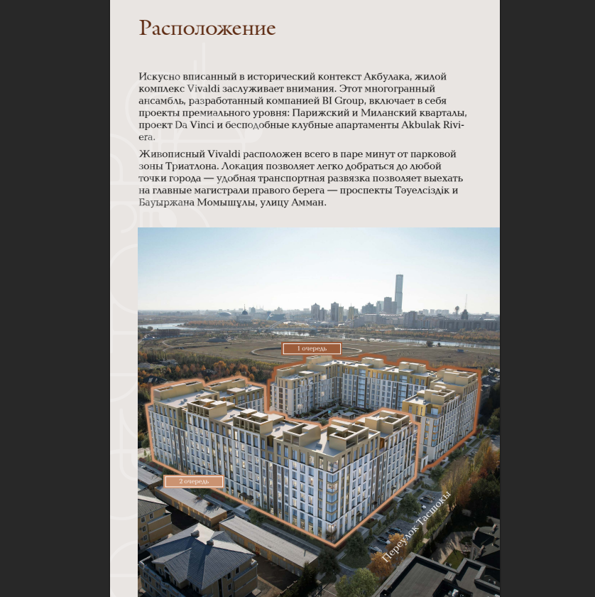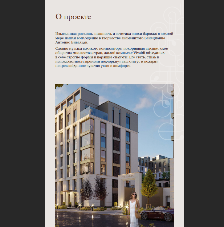 Словно музыка великого композитора, покорившая высшие слои общества множества стран, жилой комплекс Vivaldi объединил в себе строгие формы и парящие силуэты. Его стать, стиль и неподвластность времени подчеркнут ваш статус и подарят непревзойденное чувство уюта и комфорта.