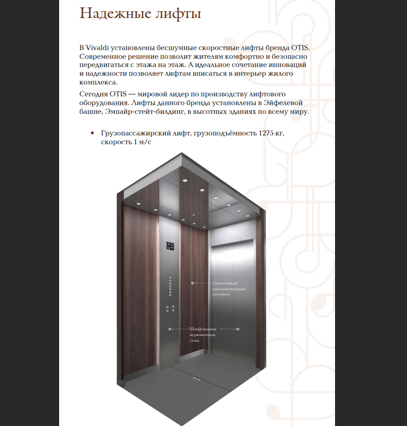 В Vivaldi установлены бесшумные скоростные лифты бренда OTIS. Современное решение позволит жителям комфортно и безопасно передвигаться с этажа на этаж. А идеальное сочетание инноваций и надежности позволяет лифтам вписаться в интерьер жилого комплекса.