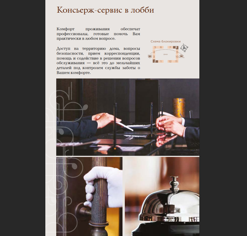 безопасности, прием корреспонденции, помощь и содействие в решении вопросов обслуживания — всё это до мельчайших деталей под контролем службы заботы о Вашем комфорте.