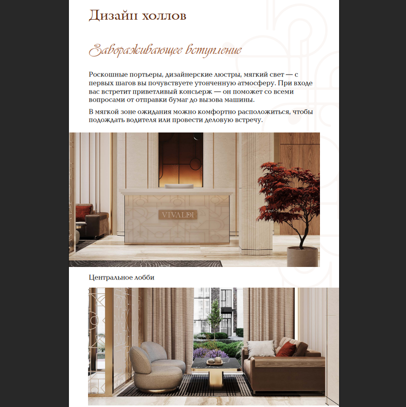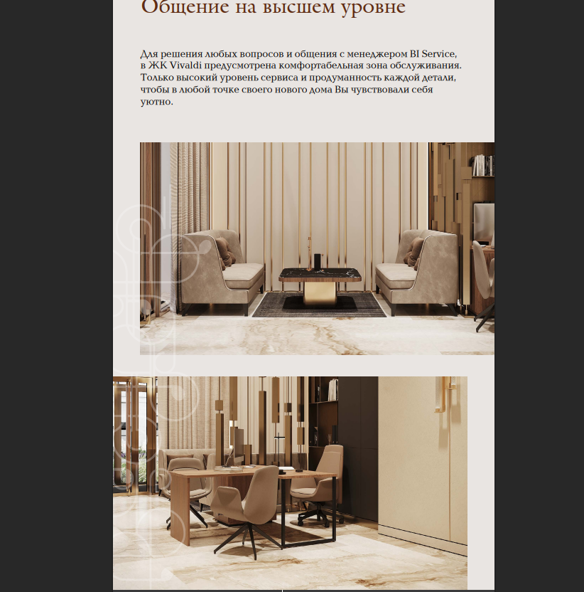 Для решения любых вопросов и общения с менеджером BI Service, в ЖК Vivaldi предусмотрена комфортабельная зона обслуживания. Только высокий уровень сервиса и продуманность каждой детали, чтобы в любой точке своего нового дома Вы чувствовали себя уютно.