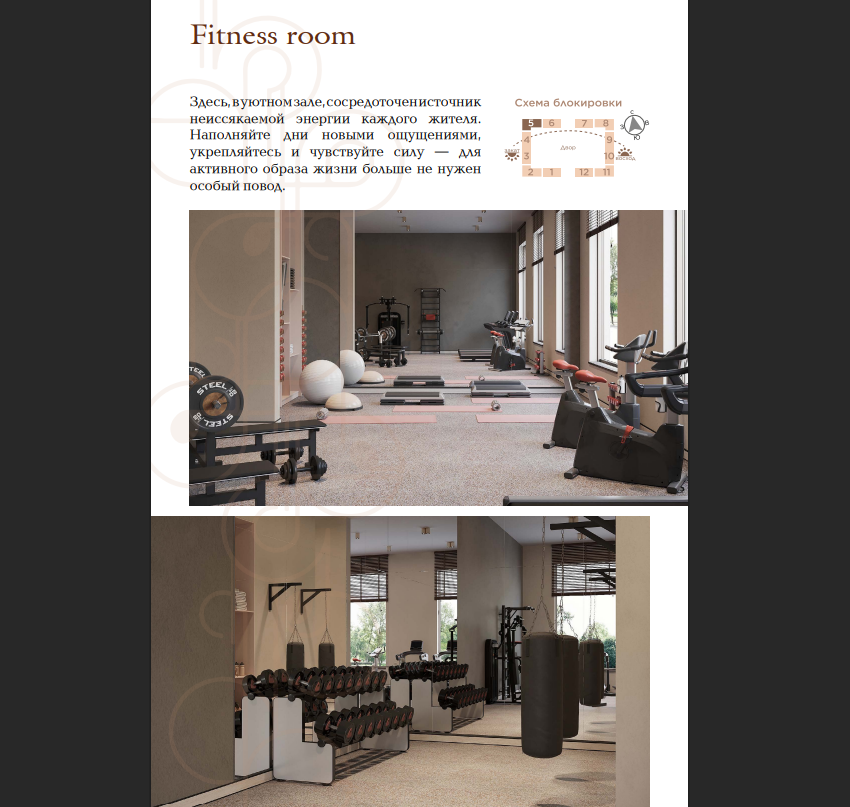 Здесь, в уютном зале, сосредоточен источник неиссякаемой энергии каждого жителя. Наполняйте дни новыми ощущениями, укрепляйтесь и чувствуйте силу — для активного образа жизни больше не нужен особый повод.