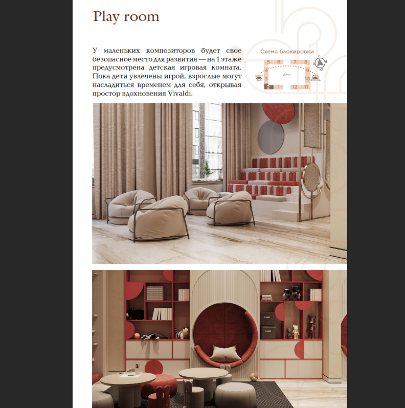 У маленьких композиторов будет свое безопасное место для развития — на 1 этаже предусмотрена детская игровая комната. Пока дети увлечены игрой, взрослые могут насладиться временем для себя, открывая простор вдохновения Vivaldi.