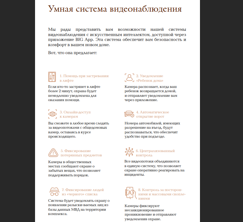 Мы рады представить вам возможности нашей системы видеонаблюдения с искусственным интеллектом, доступной через приложение BIG App. Эта система обеспечит вам безопасность и комфорт в вашем новом доме.