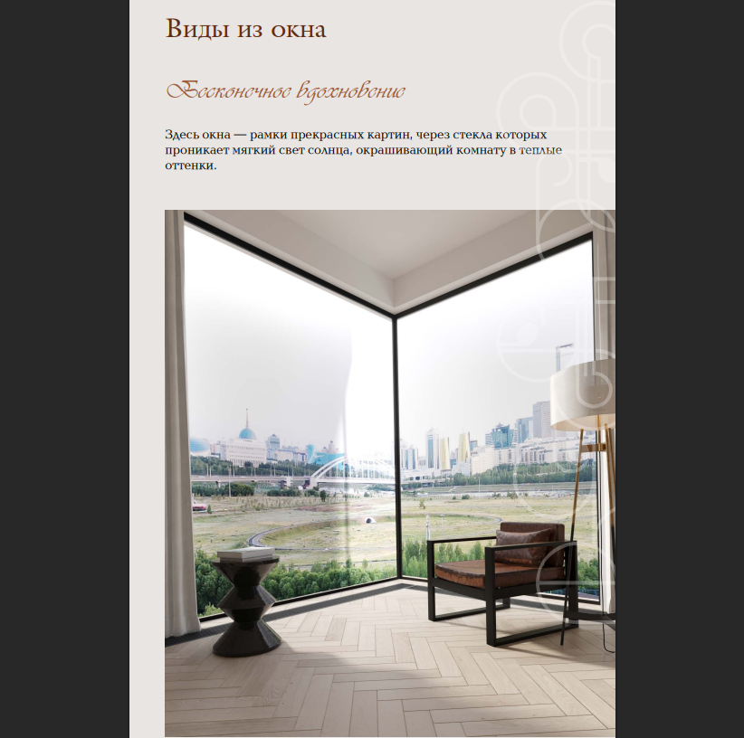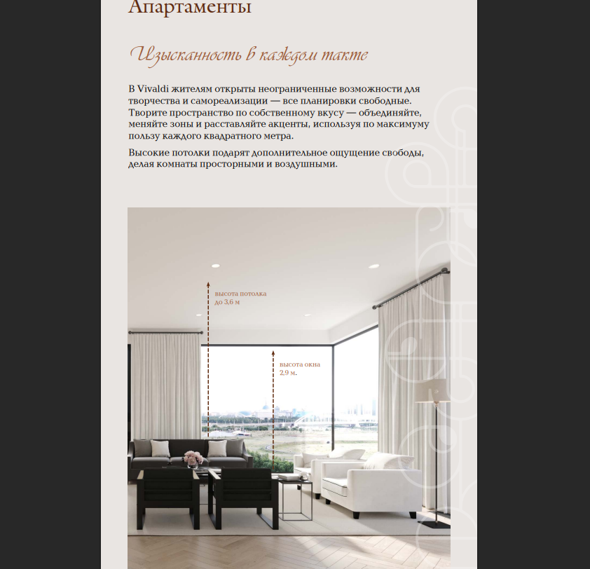Виртуозность жилого комплекса Vivaldi создают его главные кулисы — большие панорамные окна, открывающие великолепные