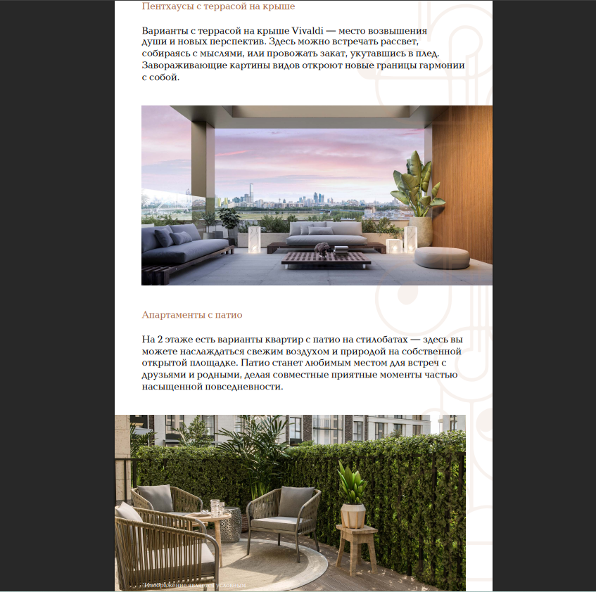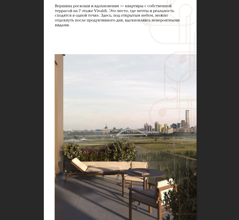 Вершина роскоши и вдохновения — квартиры с собственной террасой на 7 этаже Vivaldi. Это место, где мечты и реальность сходятся в одной точке. Здесь, под открытым небом, можно отдохнуть после продуктивного дня, вдохновляясь невероятными видами.