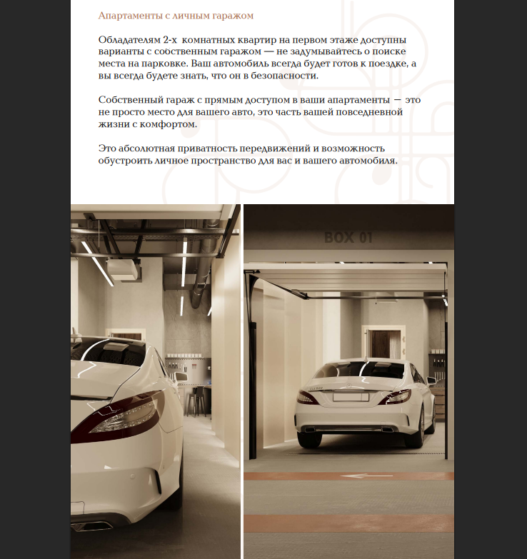 Обладателям 2-х комнатных квартир на первом этаже доступны варианты с собственным гаражом — не задумывайтесь о поиске места на парковке. Ваш автомобиль всегда будет готов к поездке, а вы всегда будете знать, что он в безопасности. Собственный гараж с прямым доступом в ваши апартаменты – это не просто место для вашего авто, это часть вашей повседневной жизни с комфортом. Это абсолютная приватность передвижений и возможность обустроить личное пространство для вас и вашего автомобиля