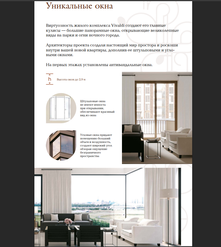 виды на парки и огни ночного города. Архитекторы проекта создали настоящий мир простора и роскоши внутри вашей новой квартиры, дополнив ее штульповыми и угловыми окнами. На первых этажах установлены антивандальные окна.