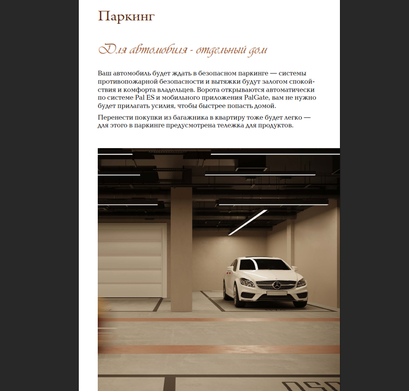 Ваш автомобиль будет ждать в безопасном паркинге — системы противопожарной безопасности и вытяжки будут залогом спокойствия и комфорта владельцев. Ворота открываются автоматически по системе Pal ES и мобильного приложения PalGate, вам не нужно будет прилагать усилия, чтобы быстрее попасть домой. Перенести покупки из багажника в квартиру тоже будет легко —для этого в паркинге предусмотрена тележка для продуктов.