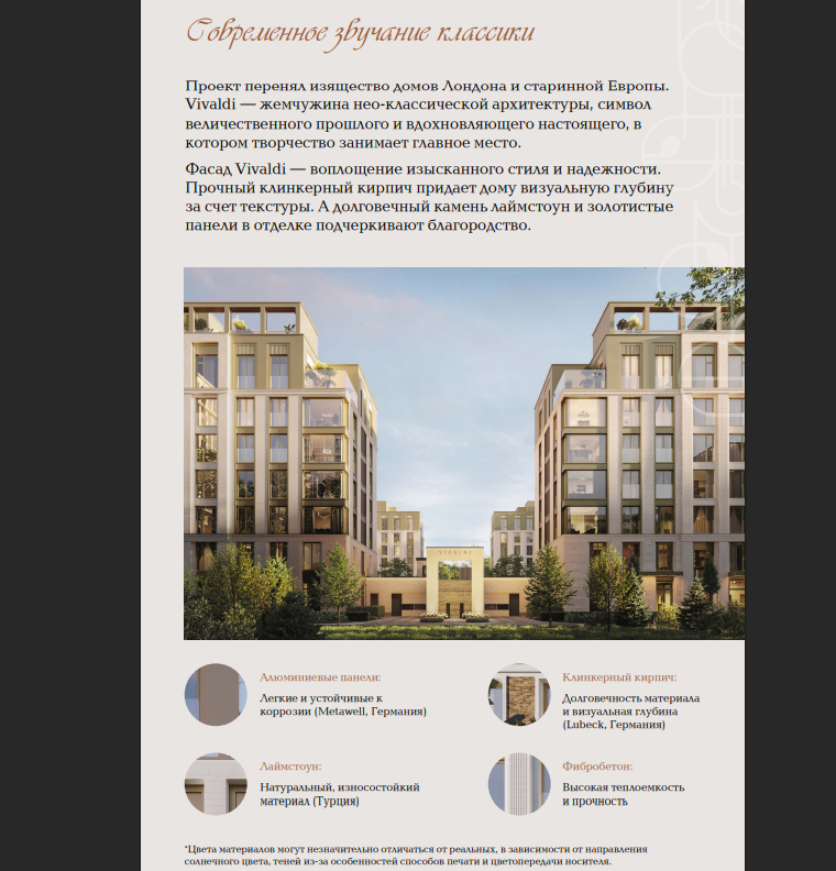 Проект перенял изящество домов Лондона и старинной Европы. Vivaldi — жемчужина нео-классической архитектуры, символ величественного прошлого и вдохновляющего настоящего, в котором творчество занимает главное место. Фасад Vivaldi — воплощение изысканного стиля и надежности. Прочный клинкерный кирпич придает дому визуальную глубину за счет текстуры. А долговечный камень лаймстоун и золотистые