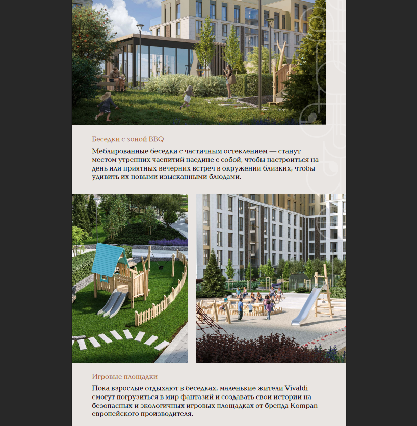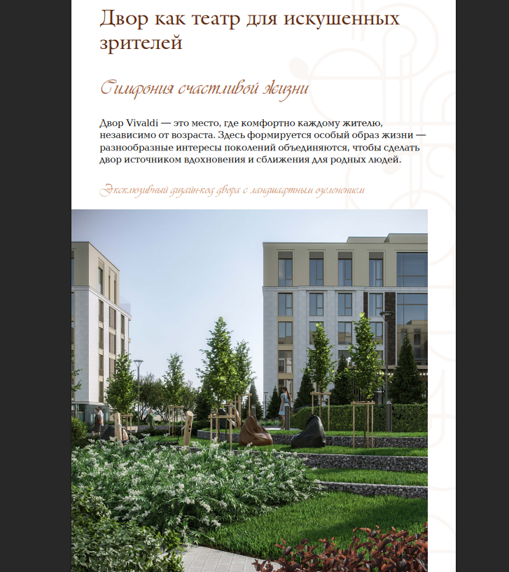 Двор Vivaldi — это место, где комфортно каждому жителю, независимо от возраста. Здесь формируется особый образ жизни —разнообразные интересы поколений объединяются, чтобы сделать двор источником вдохновения и сближения для родных людей.