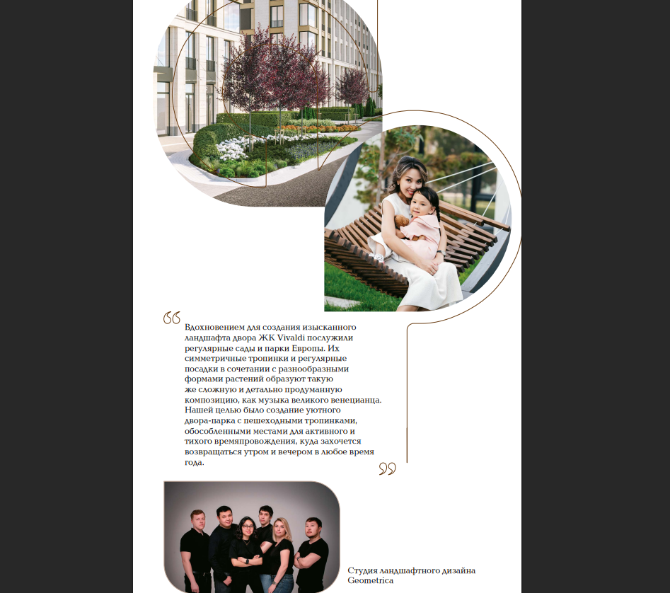 Вдохновением для создания изысканного ландшафта двора ЖК Vivaldi послужили регулярные сады и парки Европы. Их симметричные тропинки и регулярные посадки в сочетании с разнообразными формами растений образуют такую же сложную и детально продуманную композицию, как музыка великого венецианца. Нашей целью было создание уютного двора-парка с пешеходными тропинками, обособленными местами для активного и тихого времяпровождения, куда захочется возвращаться утром и вечером в любое время года.
